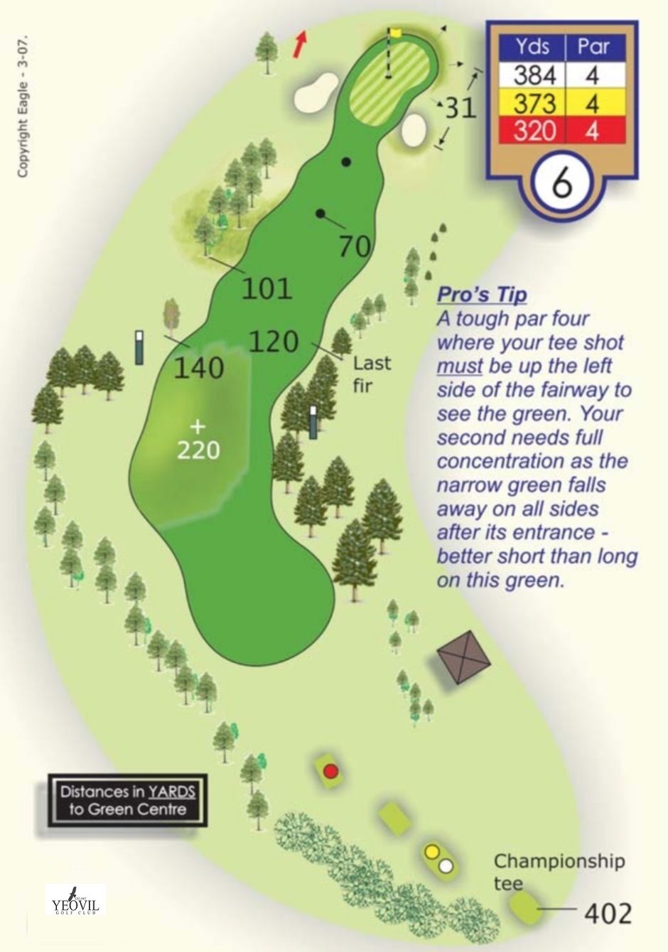 Only the low handicapper should attempt the carry over the dogleg. Us mere mortals should aim to drive straight up to the corner of the dogleg, leaving a mid-iron to a tough green to hit. Par is always a score to take here.